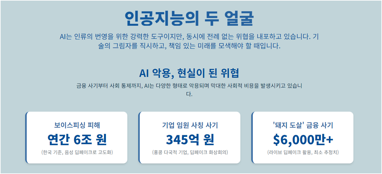 AI 기술은 매우 강력하지만, 잘못 사용될 경우 개인이나 사회에 해를 끼칠 수 있습니다. 예를 들어, '딥페이크'라는 기술을 사용하여 사람들이 실제로 하지 않은 말을 하는 영상을 만들 수 있습니다. 이러한 영상이 개인을 겨냥해 사용된다면, 그 사람은 허위 증거에 맞서 싸워야 할 수도 있습니다.