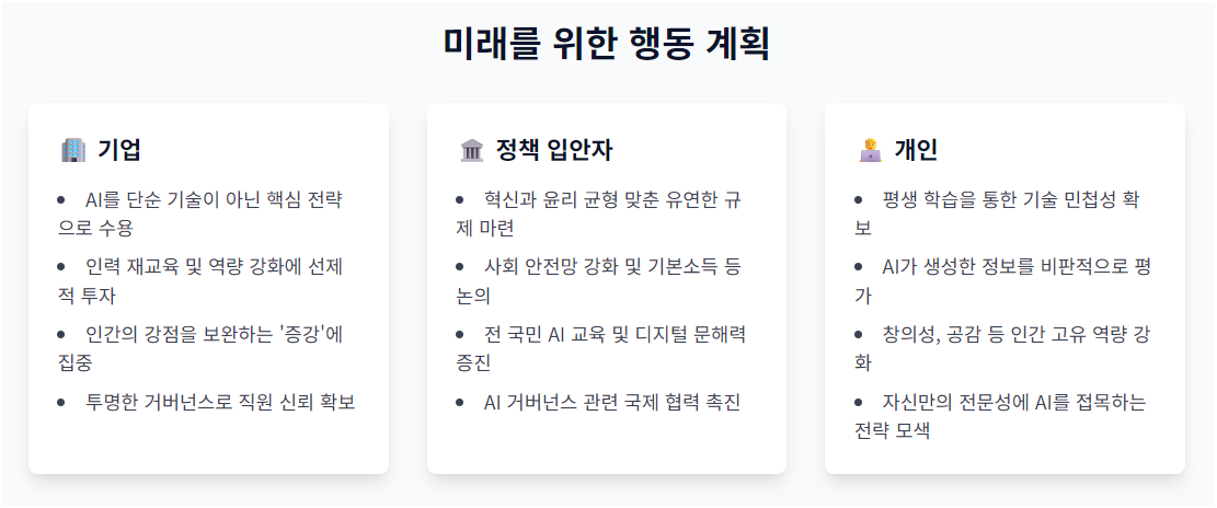 - 많은 연구에서 AI로 인해 창출될 일자리가 사라질 일자리보다 많을 수 있다고 언급.