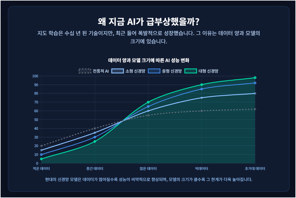 - 반면, 신경망(Neural Network)과 딥러닝 기반의 현대 AI는 데이터가 많아질수록, 그리고 모델의 규모(신경망의 크기)가 커질수록 성능이 지속해서 향상됩니다.