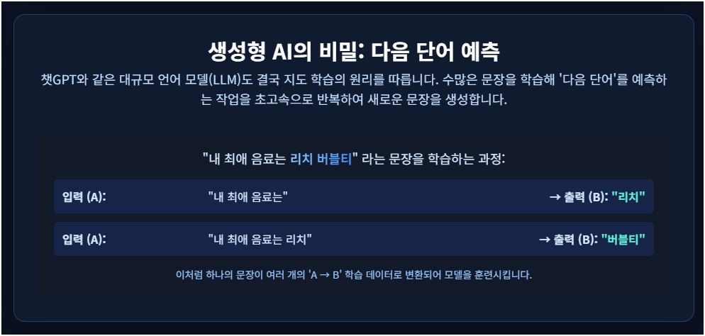 - 인터넷의 방대한 텍스트를 학습하여, 주어진 단어들(A) 다음에 올 가장 확률 높은 단어(B)를 예측하는 작업을 반복함으로써 문장을 생성합니다.