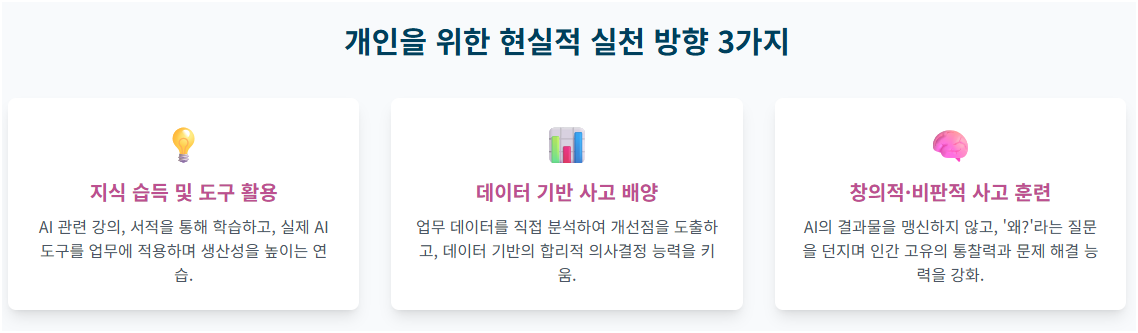 기업이 AI를 잘 활용하기 위해 문화, 프로세스, 의사결정 구조를 변화시켜야 하듯이, 개인 또한 AI 시대에 맞춰 자신의 역할과 역량을 재정의하고 변화해야 합니다. 단순히 AI 도구를 사용하는 것을 넘어, AI가 잘하는 일을 이해하고, AI와 협력하며, AI가 할 수 없는 인간 고유의 역량을 강화하는 것이 중요합니다.
